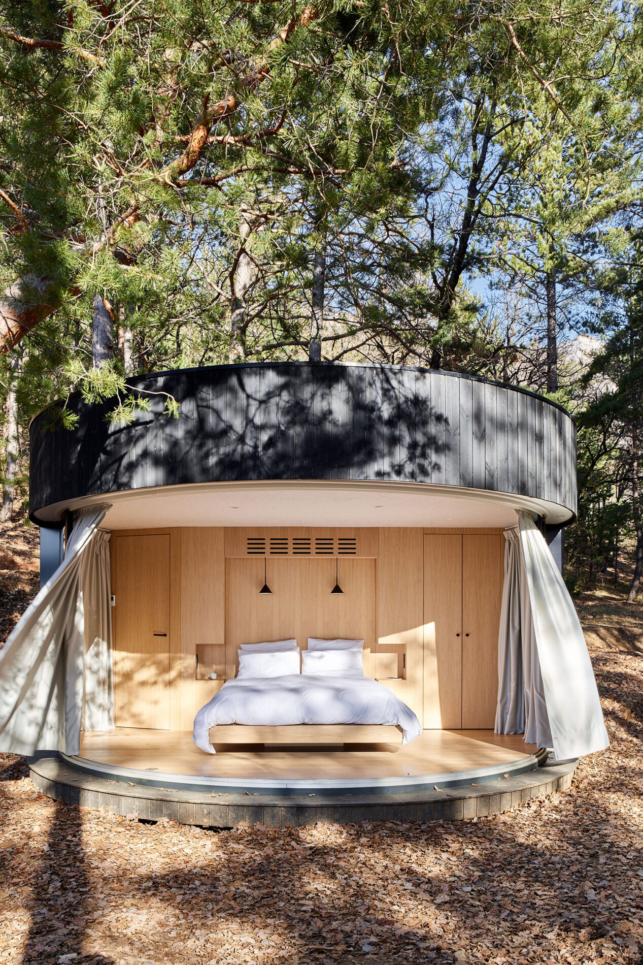 Villa Wossa, created from an historic chalet, provides 150m² of luxurious living space — including a suite, lounge, and fully equipped kitchen — ideal for family or friends. The Lumipod 6 “Wossa Rund” adds 26m² of flexible space, which can transform from an outdoor lounge to an additional bedroom on request. Outside, a 500m² biotope surrounds a geothermal infinity pool, while the private wellness area includes a terrace, a Lumipod Sauna by the pond, and a Jacuzzi.