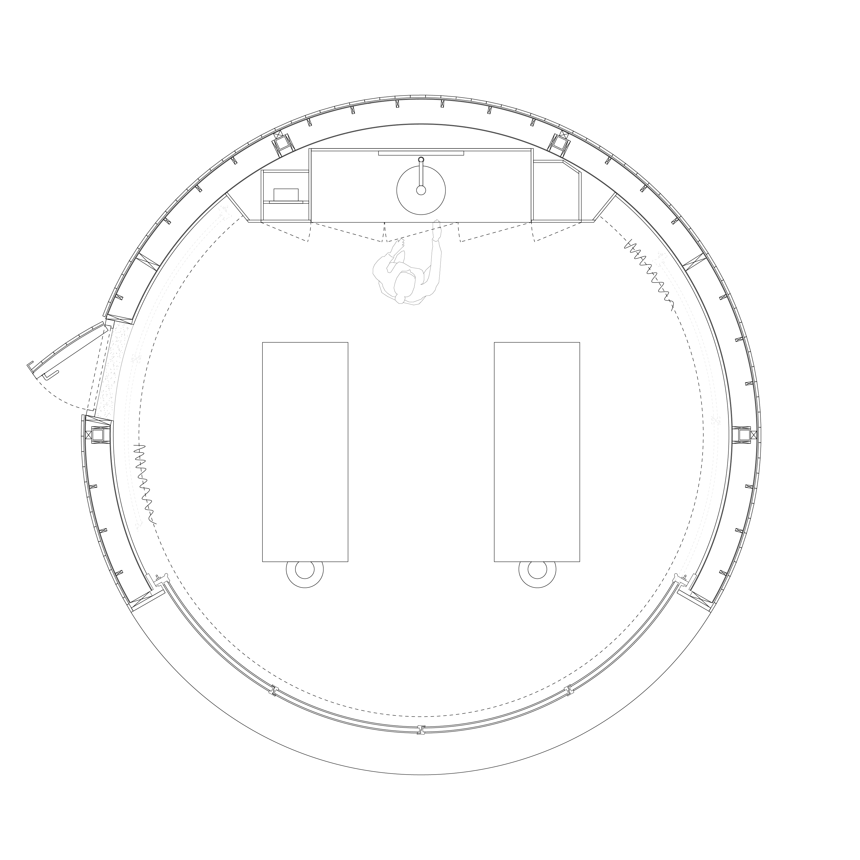 - Paroi courbe extérieure à ossature bois : isolation en ouate de cellulose, film pare-pluie sur face extérieure, film pare-vapeur sur face intérieure.