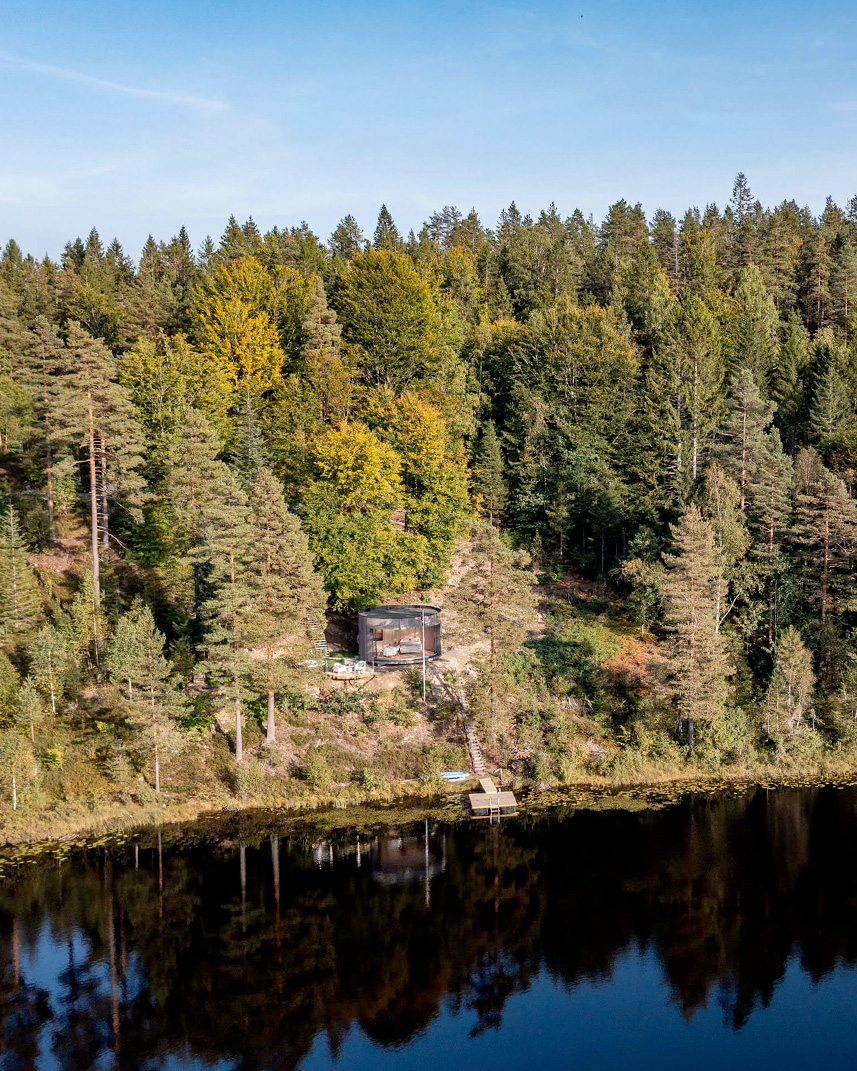 Cadre incroyable pour ce Lumipod 6 installé à moins de deux heures au sud d'Oslo, complètement immergé dans la forêt avec son ponton privé et un panorama à couper le souffle sur le lac Kringlevann.