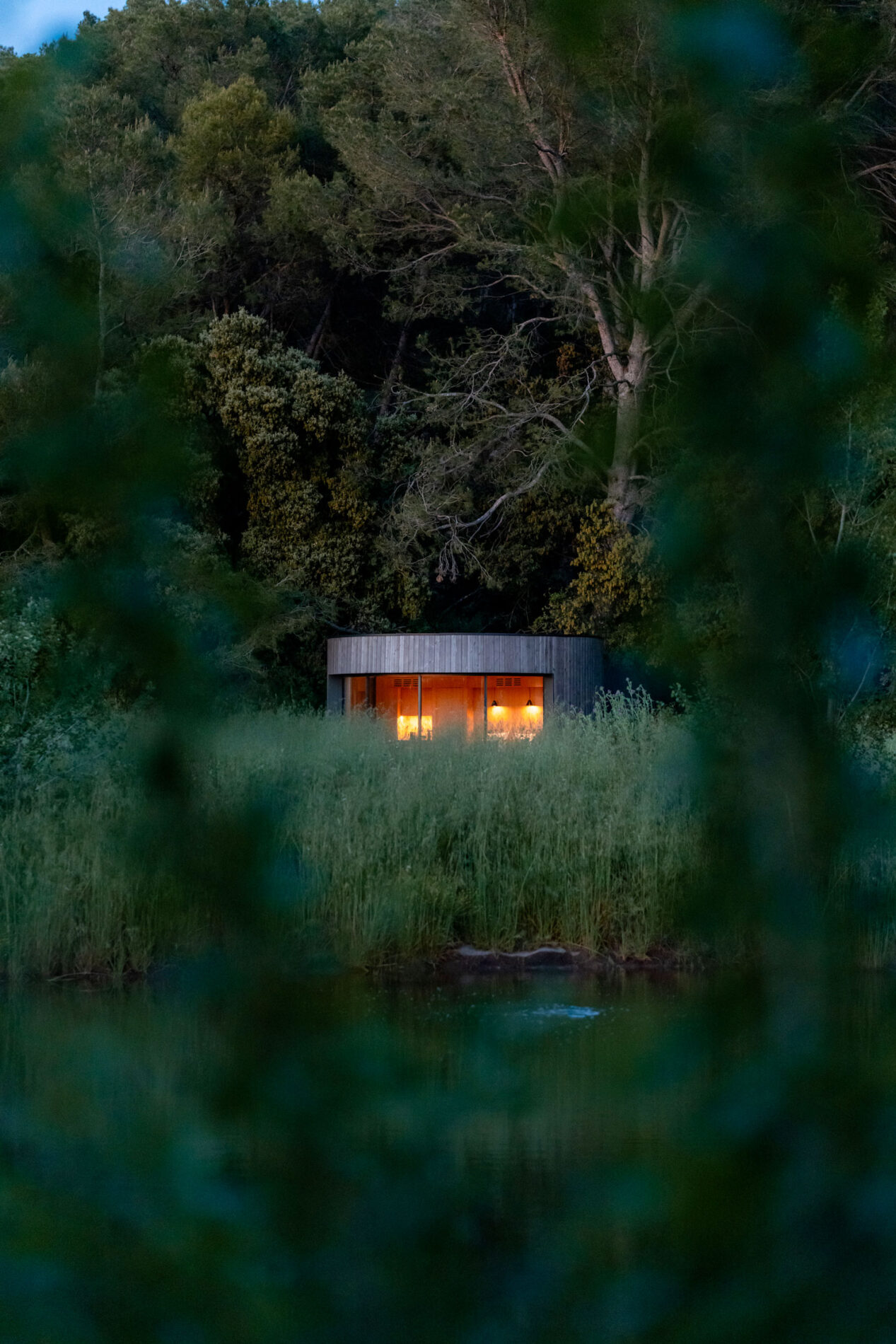 Exposition éphémère d'un Lumipod Sauna au bardage noir à la Pépinière Charvin ; un lieu unique en son genre, surplombant le lac d'Annecy, véritable havre de paix où sont collectionnées les plus belles espèces d'arbres et de végétaux.