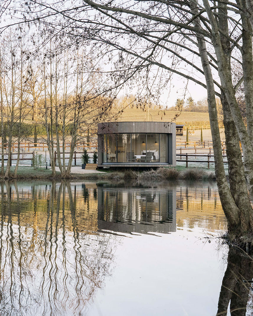 Lumipod 6 installé en bordure d'étang dans le magnifique et confidentiel Domaine de Rymska, hôtel 5 étoiles et Relais & Châteaux situé au cœur de la Bourgogne, à quelques kilomètres de Beaune.
