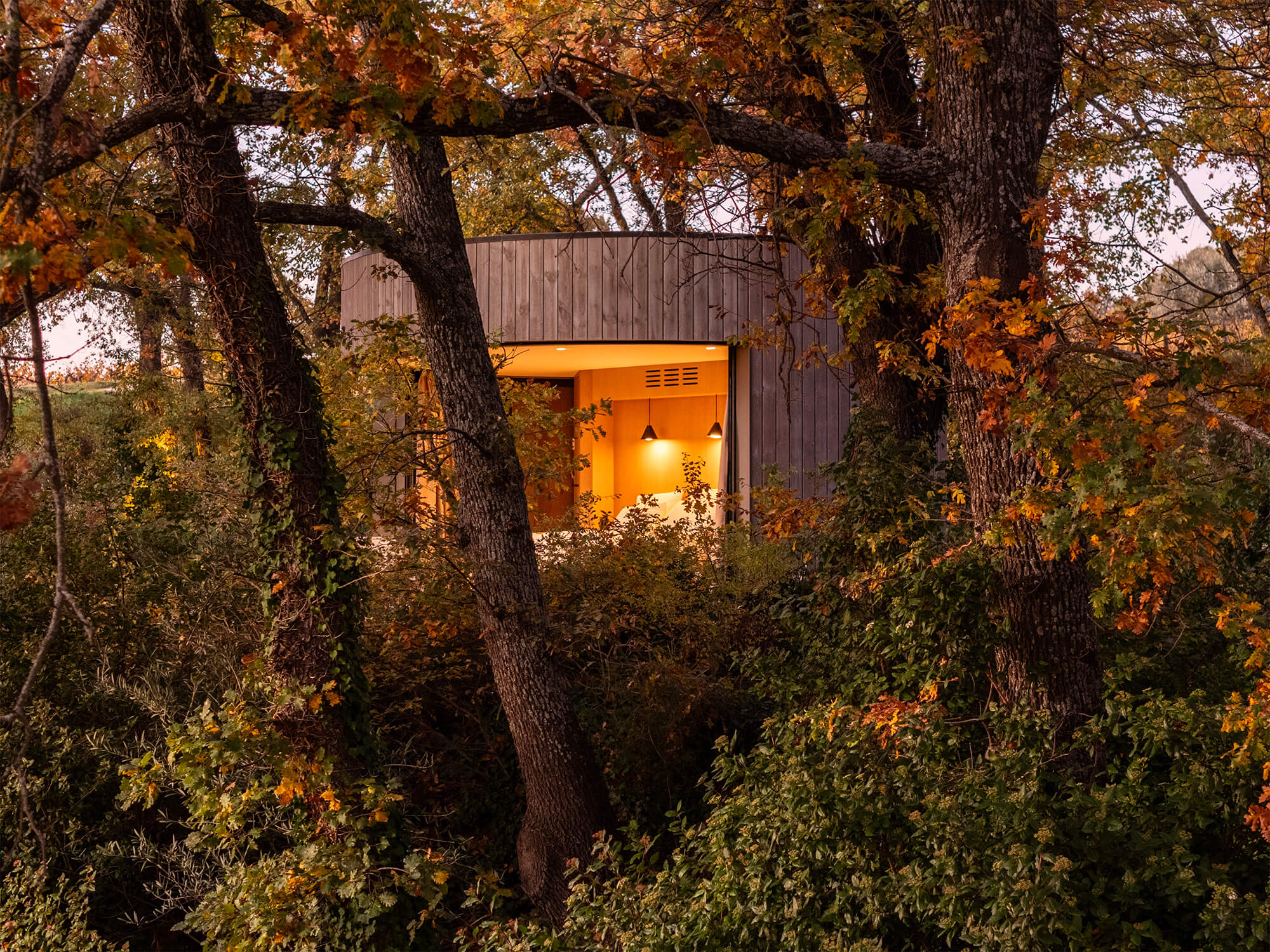 Installés à mi-chemin entre les vignes du domaine et des parcelles d’oliviers, ces trois Lumipod 5 se fondent dans le décor et offrent à leurs hôtes une véritable expérience immersive entre dedans et dehors, avec vue imprenable et nature enveloppante. Un travail paysager soigneux a été réalisé pour créer un cheminement permettant l’accès par le dos de chaque unité, et des terrasses individuelles.