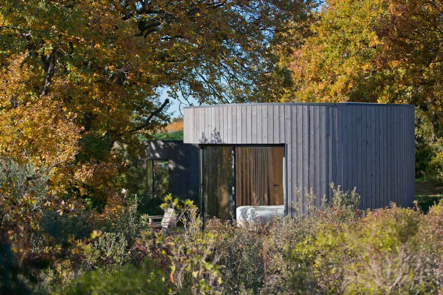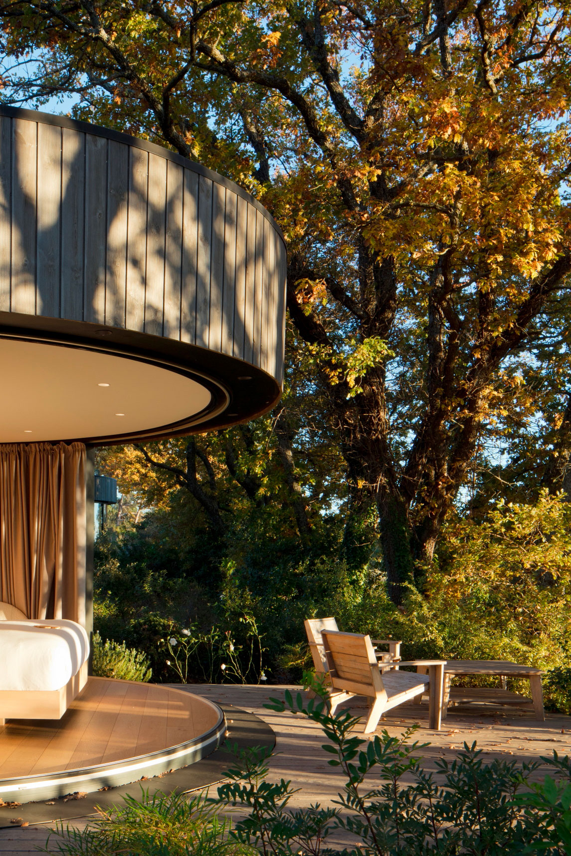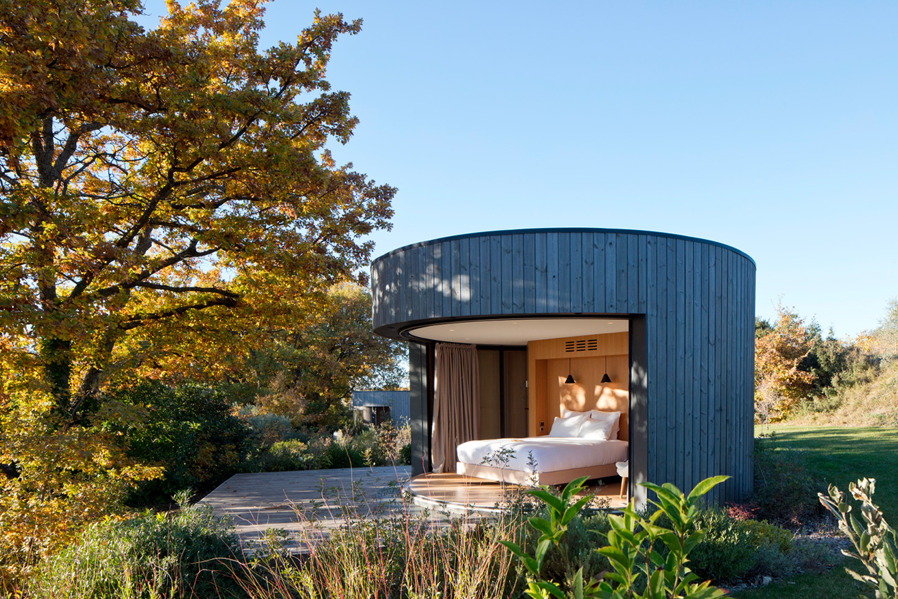 Installés à mi-chemin entre les vignes du domaine et des parcelles d’oliviers, ces trois Lumipod 5 se fondent dans le décor et offrent à leurs hôtes une véritable expérience immersive entre dedans et dehors, avec vue imprenable et nature enveloppante. Un travail paysager soigneux a été réalisé pour créer un cheminement permettant l’accès par le dos de chaque unité, et des terrasses individuelles.