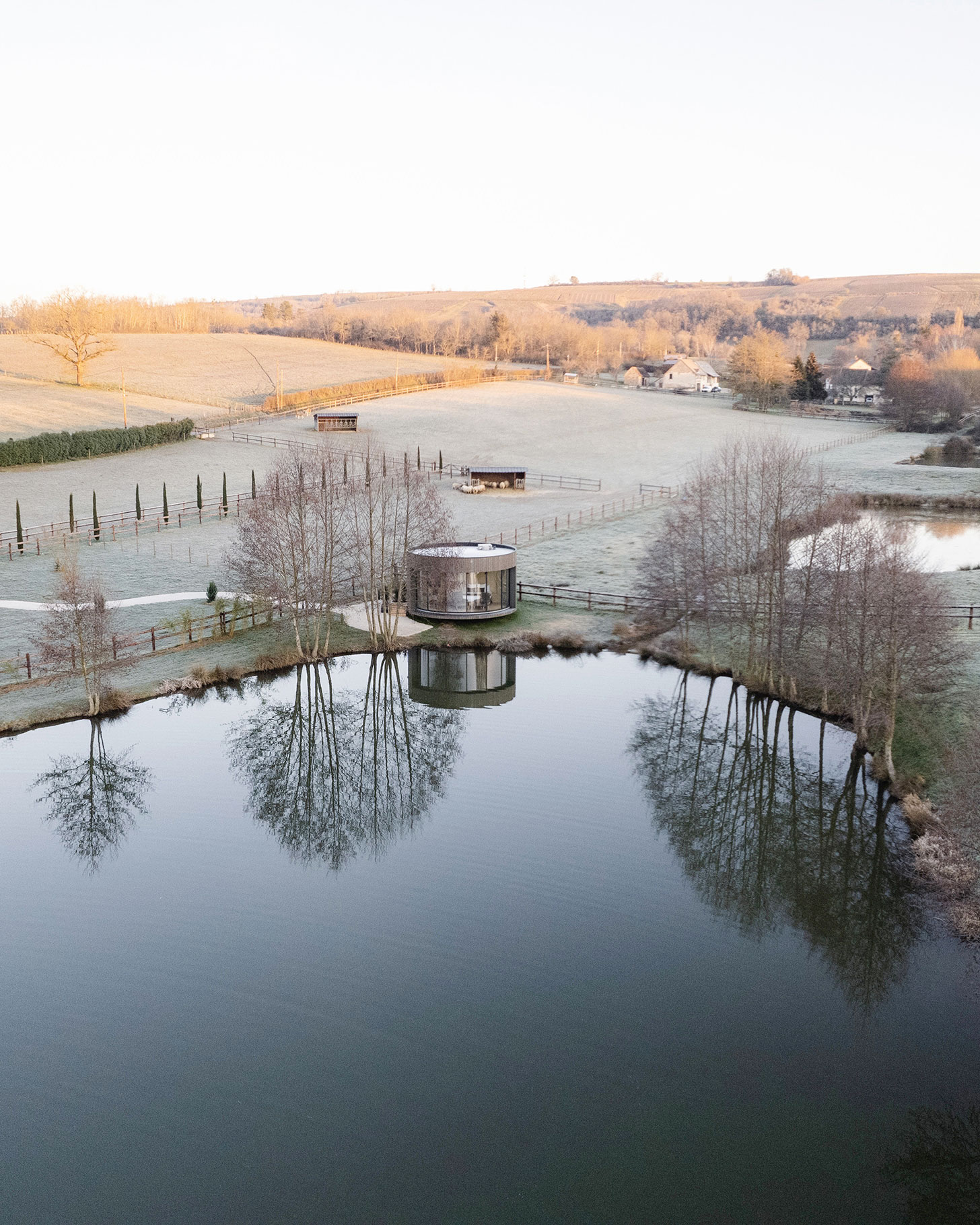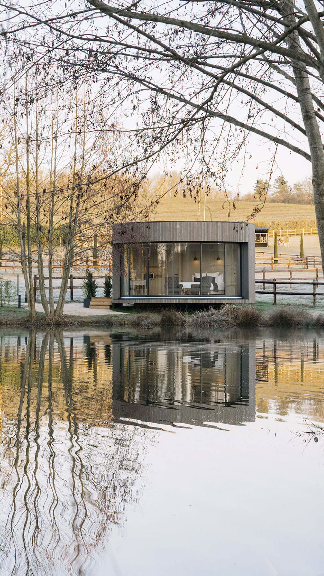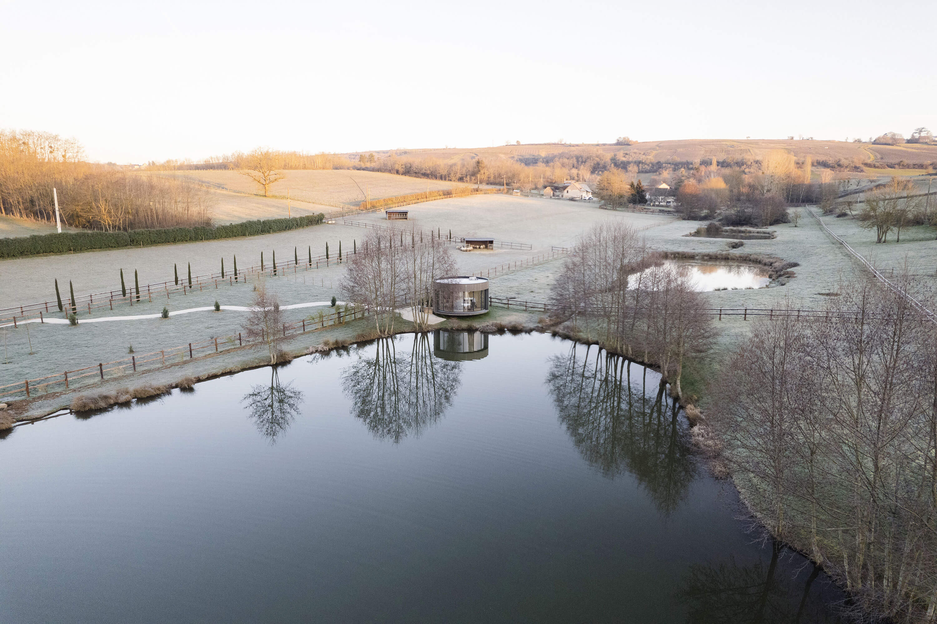 LumiPod 6 installé en bordure d’étang dans le magnifique Domaine de Rymska, hôtel 5 étoiles Relais & Château au cœur de la Bourgogne, à 30km de Beaune.