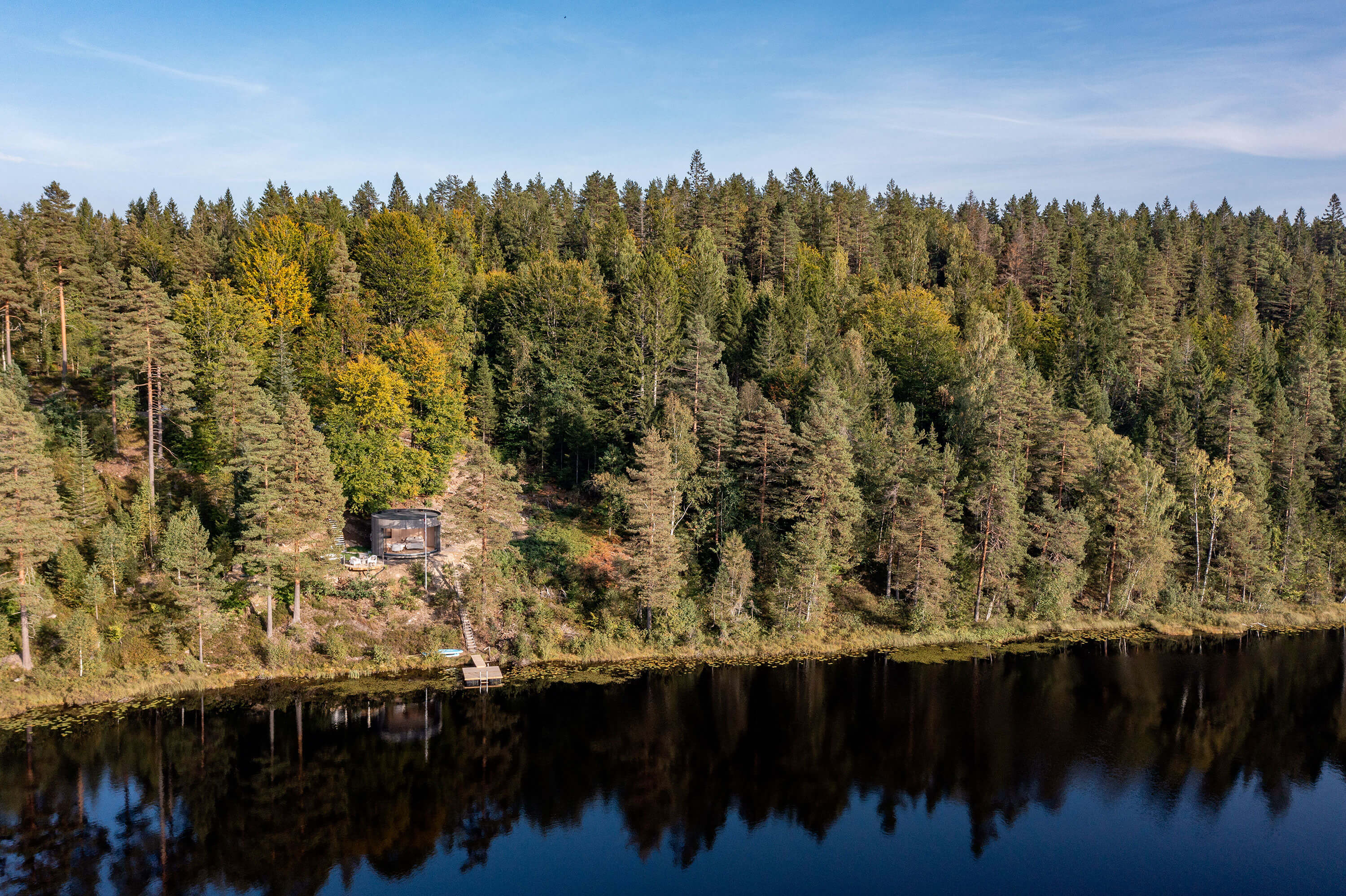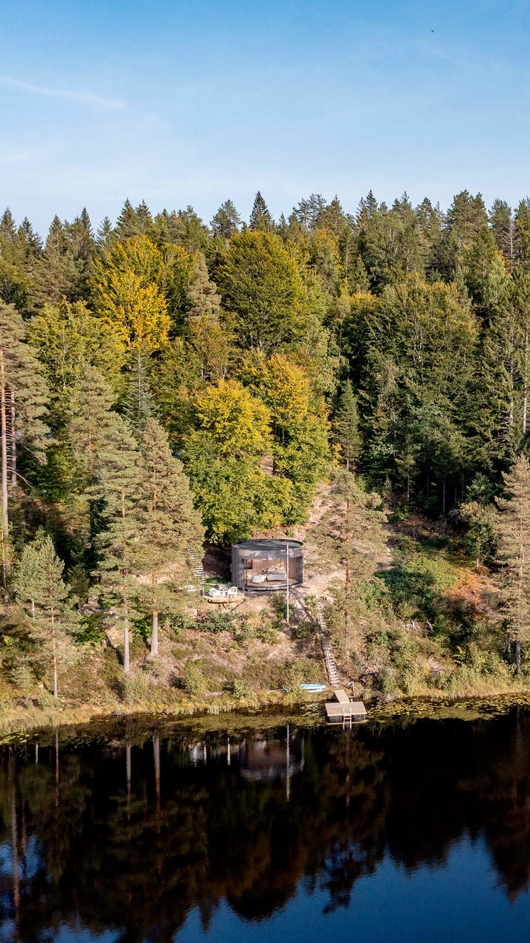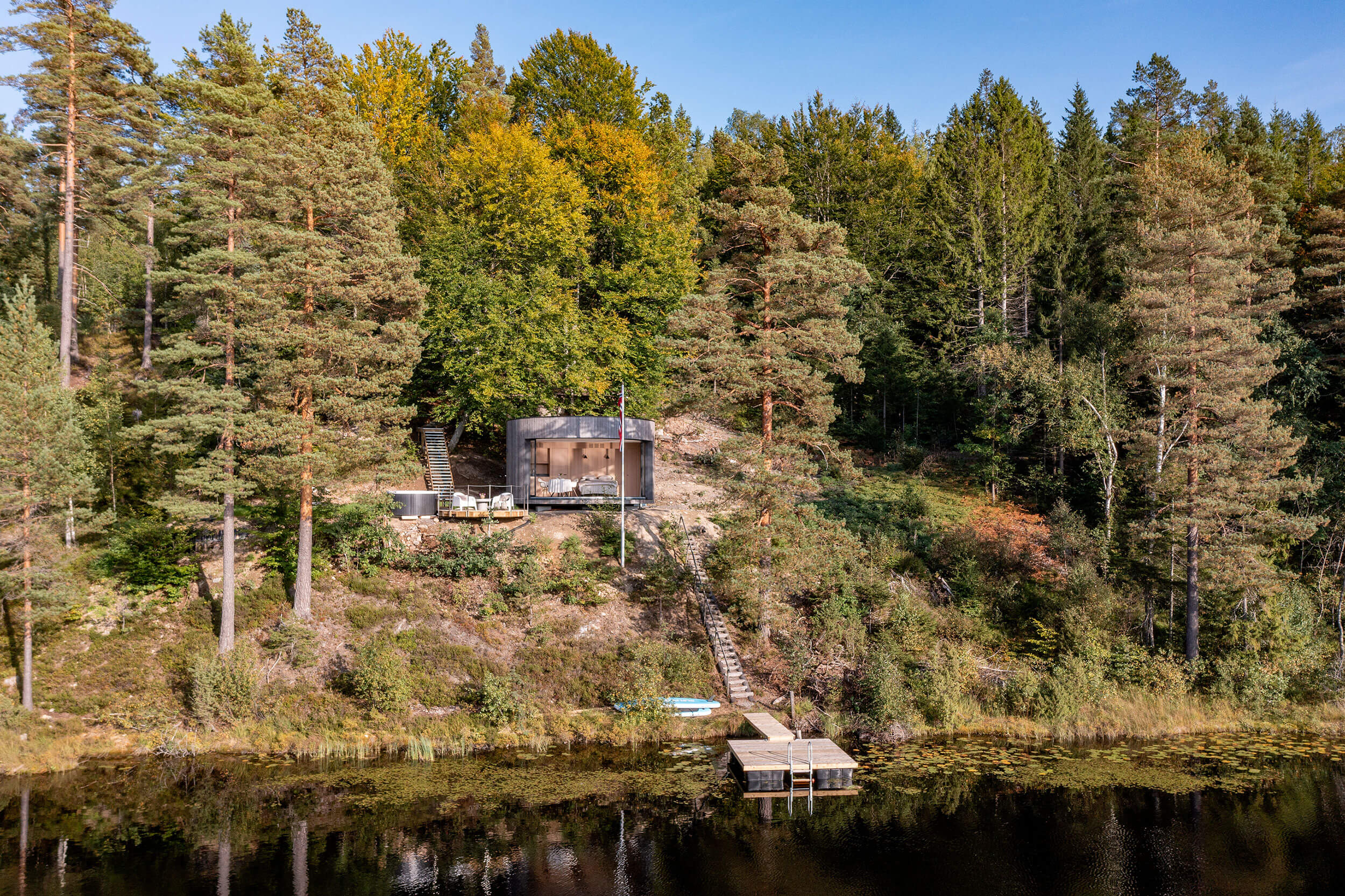Cadre incroyable pour ce Lumipod 6 installé à moins de deux heures au sud d’Oslo, complètement immergé dans la forêt avec son ponton privé et un panorama à couper le souffle sur le lac Kringlevann.